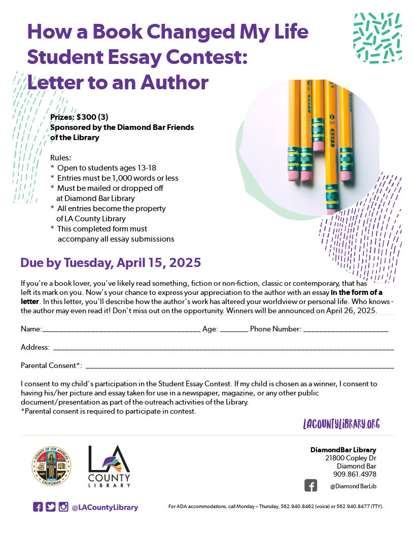 Pick up an entry form at Diamond Bar Library or download a form here. You can submit the completed entry form and essay by dropping it off or mailing it to Diamond Bar Library.